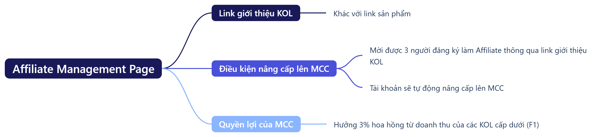 Khi vào trang quản trị Affiliate sẽ có "Link giới thiệu KOL" (khác với link sản phẩm). Mời được 3 người vào đăng ký làm Affiliate thông qua link này, tài khoản của KOL sẽ tự động nâng cấp lên thành MCC